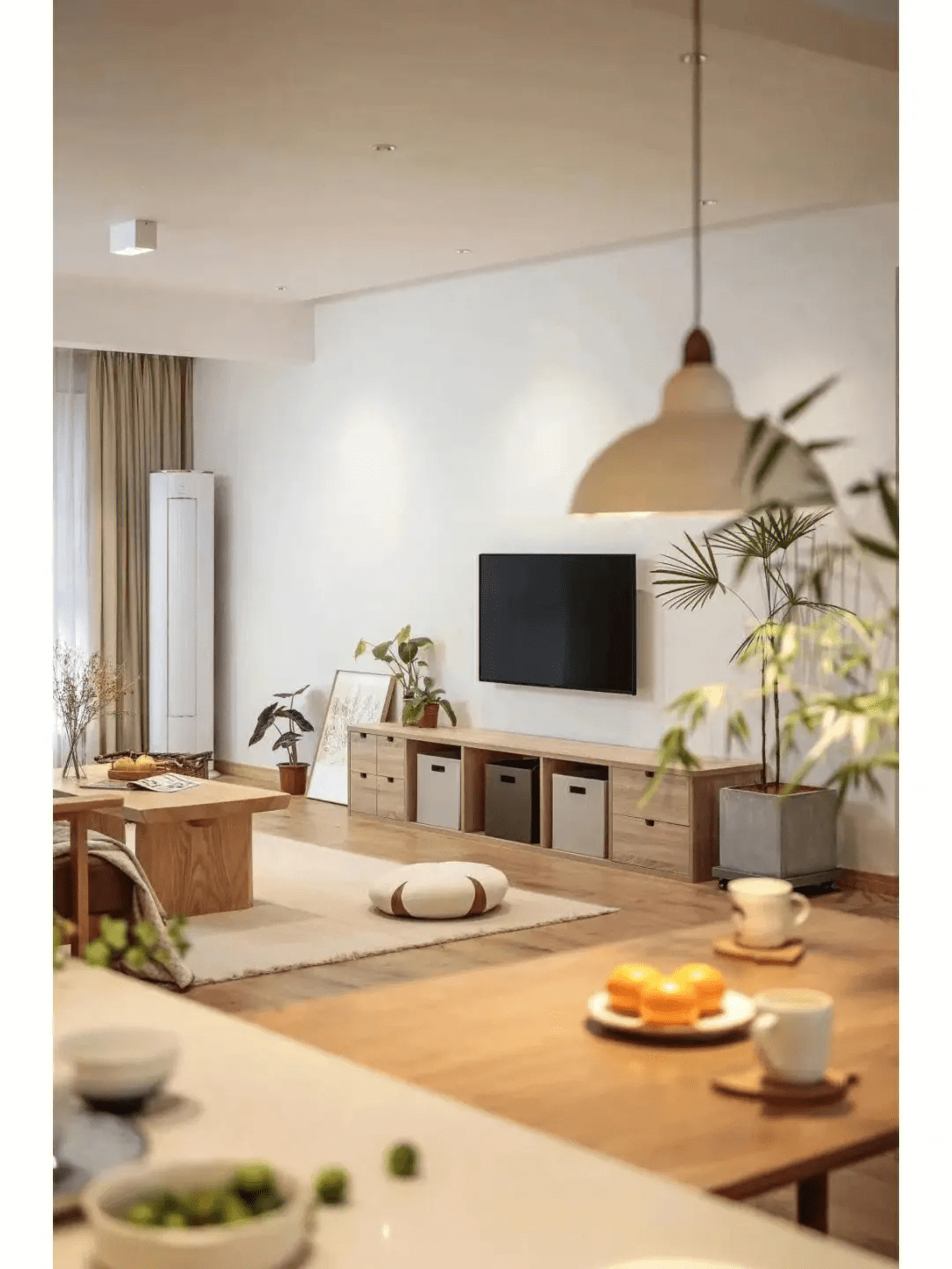 原木风中的木元素利用不止是地板,深棕色、深灰色等色彩为空间营制出稳沉、恬静的空气。琴叶榕、龟背竹、散尾葵等,原木风以木材本来的质感设想,不管是地面铺设的地板,